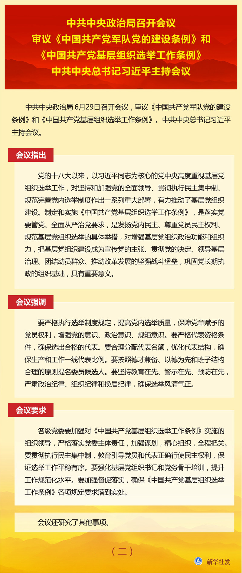 中共中央政治局召開會(huì)議 審議《中國共產(chǎn)黨軍隊(duì)黨的建設(shè)條例》和《中國共產(chǎn)黨基層組織選舉工作條例》 中共中央總書記習(xí)近平主持會(huì)議 新華社北京6月29日電 中共中央政治局6月29日召開會(huì)議,審議《中國共產(chǎn)黨軍隊(duì)黨的建設(shè)條例》和《中國共產(chǎn)黨基層組織選舉工作條例》。中共中央總書記習(xí)近平主持會(huì)議。 會(huì)議指出,黨的領(lǐng)導(dǎo)和黨的建設(shè)是人民軍隊(duì)建設(shè)發(fā)展的關(guān)鍵,關(guān)系強(qiáng)軍事業(yè)興衰成敗,關(guān)系黨和國家長治久安。制定《中國共產(chǎn)黨軍隊(duì)黨的建設(shè)條例》,是深入貫徹習(xí)近平新時(shí)代中國特色社會(huì)主義思想和黨的十九大精神的重要舉措,對(duì)增強(qiáng)“四個(gè)意識(shí)”、堅(jiān)定“四個(gè)自信”、做到“兩個(gè)維護(hù)”,貫徹軍委主席負(fù)責(zé)制,對(duì)確保黨對(duì)軍隊(duì)絕對(duì)領(lǐng)導(dǎo),確保有效履行新時(shí)代軍隊(duì)使命任務(wù),確保人民軍隊(duì)永葆性質(zhì)、宗旨、本色,對(duì)實(shí)現(xiàn)黨在新時(shí)代的強(qiáng)軍目標(biāo)、把人民軍隊(duì)全面建成世界一流軍隊(duì),具有重要意義。 會(huì)議強(qiáng)調(diào),要毫不動(dòng)搖堅(jiān)持黨對(duì)軍隊(duì)絕對(duì)領(lǐng)導(dǎo),全面深入貫徹軍委主席負(fù)責(zé)制,持續(xù)深化政治整訓(xùn),做到絕對(duì)忠誠、絕對(duì)純潔、絕對(duì)可靠。要堅(jiān)持聚焦聚力備戰(zhàn)打仗,把戰(zhàn)斗力這個(gè)唯一的根本的標(biāo)準(zhǔn)貫徹到人民軍隊(duì)黨的建設(shè)全過程和各方面,推動(dòng)黨的政治優(yōu)勢和組織優(yōu)勢轉(zhuǎn)化為制勝優(yōu)勢。要堅(jiān)持貫徹全面從嚴(yán)治黨要求,堅(jiān)定不移正風(fēng)肅紀(jì),堅(jiān)決糾治形式主義、官僚主義。要堅(jiān)持勇于自我革命,不斷自我凈化、自我完善、自我革新、自我提高。 會(huì)議要求,要加強(qiáng)《中國共產(chǎn)黨軍隊(duì)黨的建設(shè)條例》學(xué)習(xí)宣傳和貫徹落實(shí)。要突出書記隊(duì)伍和班子成員,抓好學(xué)習(xí)培訓(xùn),提高抓黨的建設(shè)的意識(shí)和能力。要強(qiáng)化領(lǐng)導(dǎo)督導(dǎo),確保《中國共產(chǎn)黨軍隊(duì)黨的建設(shè)條例》有效執(zhí)行、落地見效。 會(huì)議指出,黨的十八大以來,以習(xí)近平同志為核心的黨中央高度重視基層黨組織選舉工作,對(duì)堅(jiān)持和加強(qiáng)黨的全面領(lǐng)導(dǎo)、貫徹執(zhí)行民主集中制、規(guī)范完善黨內(nèi)選舉制度作出一系列重大部署,有力推動(dòng)了基層黨組織建設(shè)。制定和實(shí)施《中國共產(chǎn)黨基層組織選舉工作條例》,是落實(shí)黨要管黨、全面從嚴(yán)治黨要求,是發(fā)揚(yáng)黨內(nèi)民主、尊重黨員民主權(quán)利、規(guī)范基層黨組織選舉的具體舉措,對(duì)增強(qiáng)基層黨組織政治功能和組織力,把基層黨組織建設(shè)成為宣傳黨的主張、貫徹黨的決定、領(lǐng)導(dǎo)基層治理、團(tuán)結(jié)動(dòng)員群眾、推動(dòng)改革發(fā)展的堅(jiān)強(qiáng)戰(zhàn)斗堡壘,鞏固黨長期執(zhí)政的組織基礎(chǔ),具有重要意義。 會(huì)議強(qiáng)調(diào),要嚴(yán)格執(zhí)行選舉制度規(guī)定,提高黨內(nèi)選舉質(zhì)量,保障黨章賦予的黨員權(quán)利,增強(qiáng)黨的意識(shí)、政治意識(shí)、規(guī)矩意識(shí)。要嚴(yán)格代表資格條件,確保選出合格的代表。要合理分配代表名額,優(yōu)化代表結(jié)構(gòu),確保生產(chǎn)和工作一線代表比例。要按照德才兼?zhèn)?、以德為先和班子結(jié)構(gòu)合理的原則提名委員候選人。要堅(jiān)持教育在先、警示在先、預(yù)防在先,嚴(yán)肅政治紀(jì)律、組織紀(jì)律和換屆紀(jì)律,確保選舉風(fēng)清氣正。 會(huì)議要求,各級(jí)黨委要加強(qiáng)對(duì)《中國共產(chǎn)黨基層組織選舉工作條例》實(shí)施的組織領(lǐng)導(dǎo),嚴(yán)格落實(shí)黨委主體責(zé)任,加強(qiáng)謀劃,精心組織,全程把關(guān)。要貫徹執(zhí)行民主集中制,教育引導(dǎo)黨員和代表正確行使民主權(quán)利,保證選舉工作平穩(wěn)有序。要強(qiáng)化基層黨組織書記和黨務(wù)骨干培訓(xùn),提升工作規(guī)范化水平。要加強(qiáng)督促落實(shí),確?!吨袊伯a(chǎn)黨基層組織選舉工作條例》各項(xiàng)規(guī)定要求落到實(shí)處。 會(huì)議還研究了其他事項(xiàng)。 |