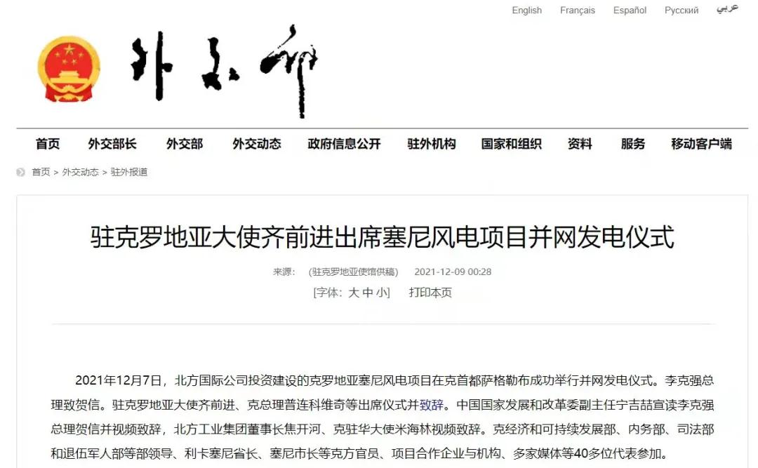 2021年12月7日,中國(guó)兵器工業(yè)集團(tuán)有限公司北方公司所屬北方國(guó)際投資、建設(shè)和運(yùn)營(yíng)的塞尼156MW風(fēng)電項(xiàng)目在克羅地亞首都薩格勒布隆重舉行并網(wǎng)發(fā)電儀式。李克強(qiáng)總理致賀信??肆_地亞總理安德烈·普連科維奇,中國(guó)駐克羅地亞大使齊前進(jìn)出席儀式并致辭。中國(guó)國(guó)家發(fā)展和改革委員會(huì)副主任寧吉喆宣讀李克強(qiáng)總理賀信并視頻致辭,中國(guó)兵器工業(yè)集團(tuán)有限公司董事長(zhǎng)焦開(kāi)河、克駐華大使米海林視頻致辭。 中華人民共和國(guó)外交部報(bào)道 普連科維奇總理在致辭中表示,感謝李克強(qiáng)總理發(fā)來(lái)賀信,他與中國(guó)領(lǐng)導(dǎo)人一直非常重視塞尼風(fēng)電項(xiàng)目投資與建設(shè)。祝賀項(xiàng)目克服疫情與地震等影響,成功并網(wǎng)發(fā)電。增加清潔可再生能源、綠色電力對(duì)克乃至歐洲都很重要,克政府的重要戰(zhàn)略和目標(biāo)之一就是低碳發(fā)展和增加清潔能源供應(yīng)。塞尼風(fēng)電項(xiàng)目占克總發(fā)電量將達(dá)3.5%,對(duì)克實(shí)現(xiàn)2022年可再生能源比例30%目標(biāo)具有很大幫助。此次投資使北方國(guó)際成為在克最大的清潔能源投資企業(yè)。非常歡迎更多中國(guó)企業(yè)擴(kuò)大對(duì)克投資。 寧吉喆宣讀李克強(qiáng)總理賀信并視頻致辭時(shí)表示,2017年11月第六次中國(guó)—中東歐國(guó)家領(lǐng)導(dǎo)人會(huì)晤期間,在李克強(qiáng)總理和普連科維奇總理等中東歐16國(guó)領(lǐng)導(dǎo)人的共同見(jiàn)證下,塞尼項(xiàng)目簽署了協(xié)議。項(xiàng)目既是中國(guó)堅(jiān)定踐行綠色發(fā)展理念的具體體現(xiàn),也是中國(guó)深化與克羅地亞、與中東歐國(guó)家務(wù)實(shí)合作的生動(dòng)實(shí)踐。希望中克兩國(guó)政府部門,企業(yè)等有關(guān)各方共同努力、相互配合,運(yùn)營(yíng)好塞尼項(xiàng)目,打造出中歐綠色合作的樣板,帶動(dòng)兩國(guó)務(wù)實(shí)合作持續(xù)深入發(fā)展,造福兩國(guó)人民。