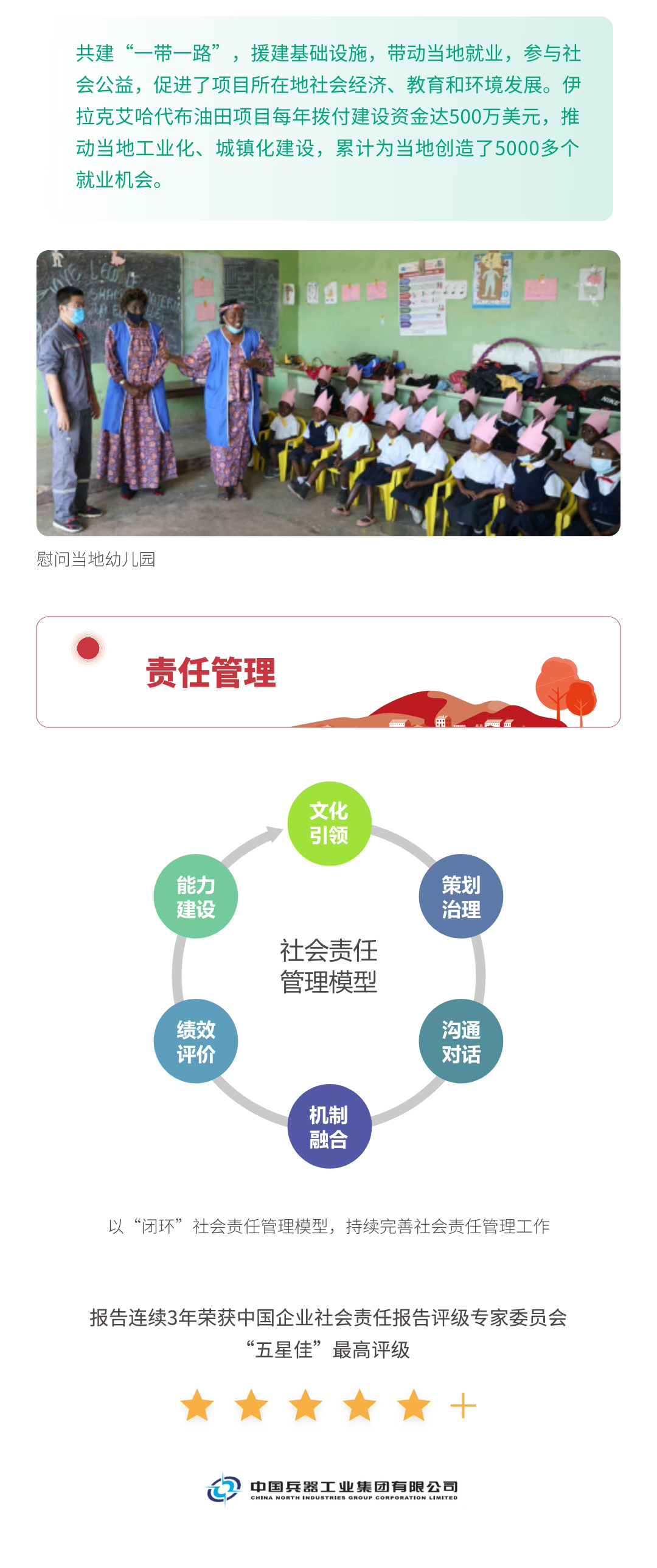 近日,兵器工業(yè)集團正式發(fā)布第十三份年度社會責任報告——《中國兵器工業(yè)集團有限公司2021年社會責任報告》,以“用心守護和平、用力爭創(chuàng)一流、用情溫暖社會”為主題,從恪守強軍首責、服務經濟建設、共創(chuàng)美好生活三個維度,向社會全面披露2021年度履責實踐和履責業(yè)績?!秷蟾妗愤B續(xù)第三年獲得中國企業(yè)社會責任報告評級專家委員會“五星佳”評級,兵器工業(yè)集團成為軍工行業(yè)唯一連續(xù)11年獲得五星及五星佳最高評級的企業(yè)。 一圖解碼兵器工業(yè)的“責任力量” |